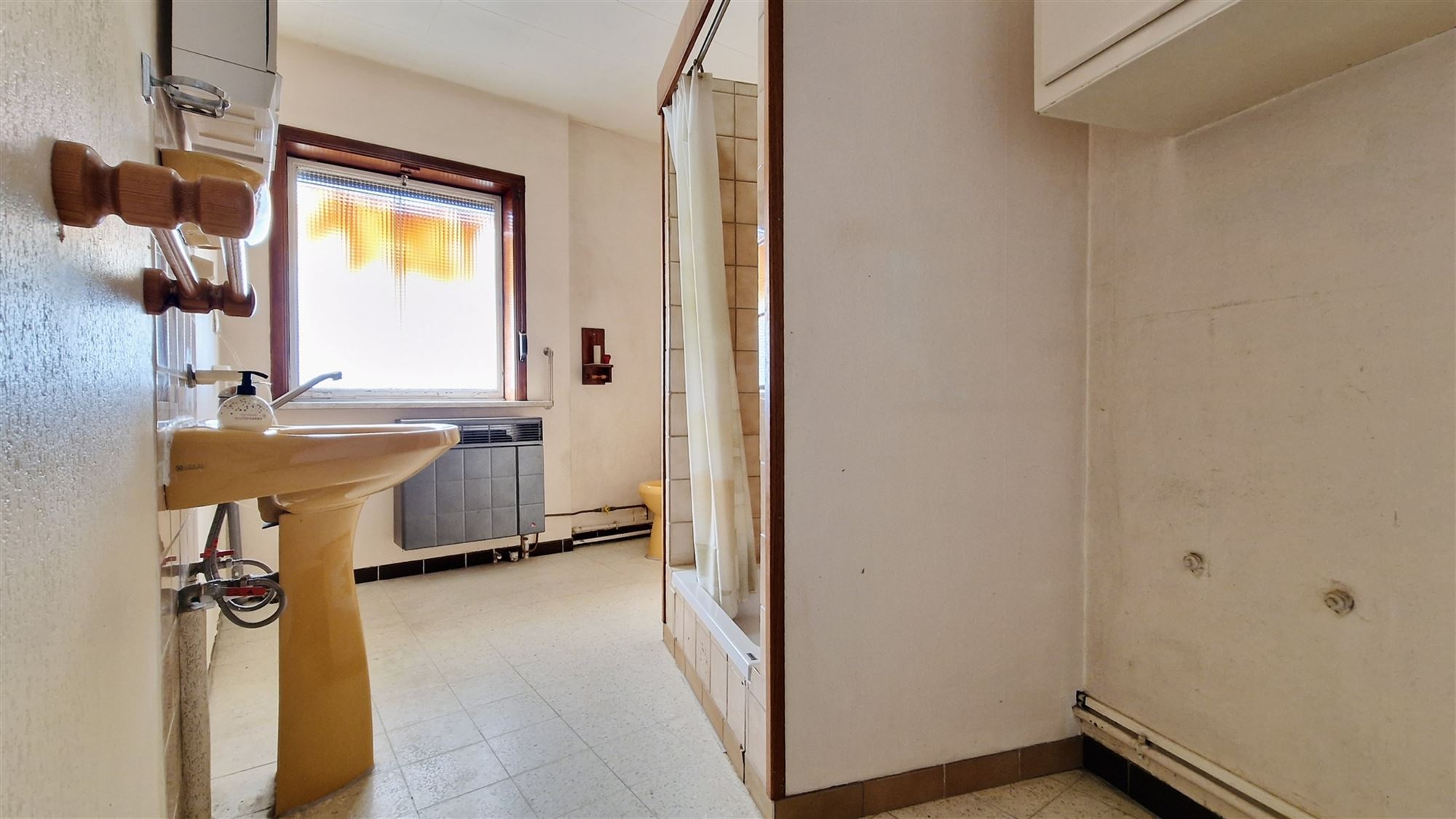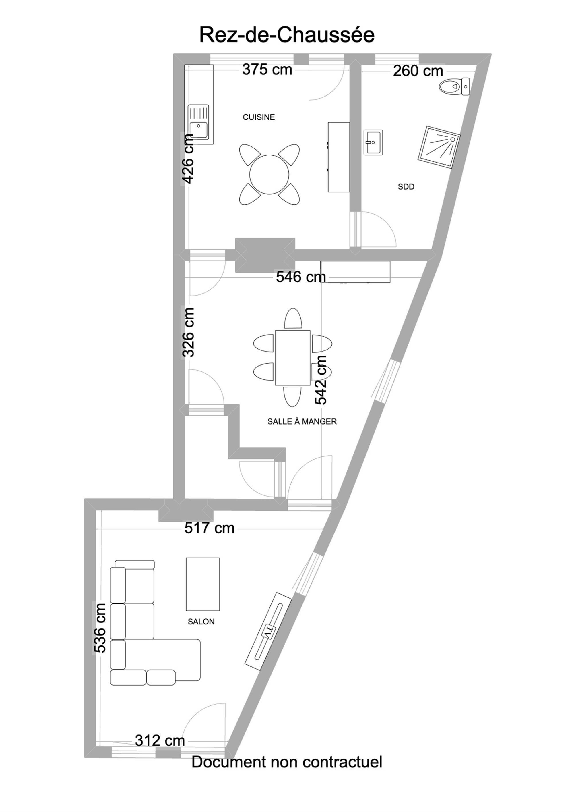** Rez-de-chaussée : dès l’entrée, un espace de 23m² utilisé comme salle à manger, un salon de 22 m² (avec accès à la cave et à l’étage), une cuisine et une salle de douche. La cuisine compte une porte d’accès aux extérieurs.