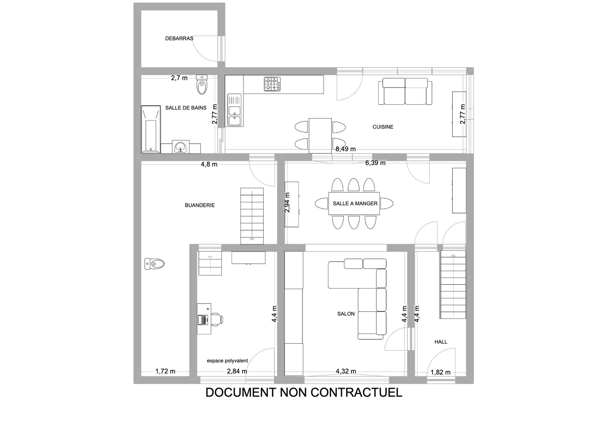 ** Rez-de-chaussée : Un petit hall d’entrée vous accueille et mène vers un espace salon et salle à manger de 37,5 m². La cuisine équipée, installée dans une véranda lumineuse de 24 m², bénéficie d’une belle vue sur le jardin. Une salle de bains, une buanderie et un espace polyvalent complètent ce niveau. Ce dernier peut être aménagé en bureau, en espace professionnel ou réhabilité en garage, comme à l’origine de la construction.
