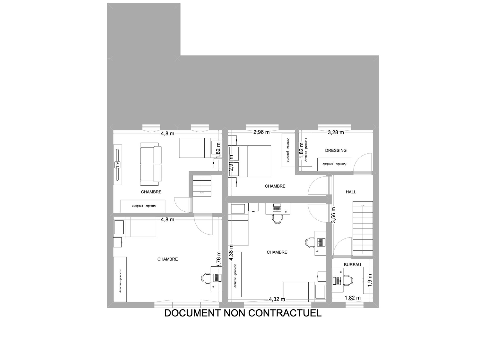 ** Premier étage : le hall de nuit dessert deux chambres de 19,3 m² et 9m², un petit bureau ainsi qu’un espace dressing. L’accès opposé mène à deux chambres supplémentaires de 11,3 m² et 18,5m²