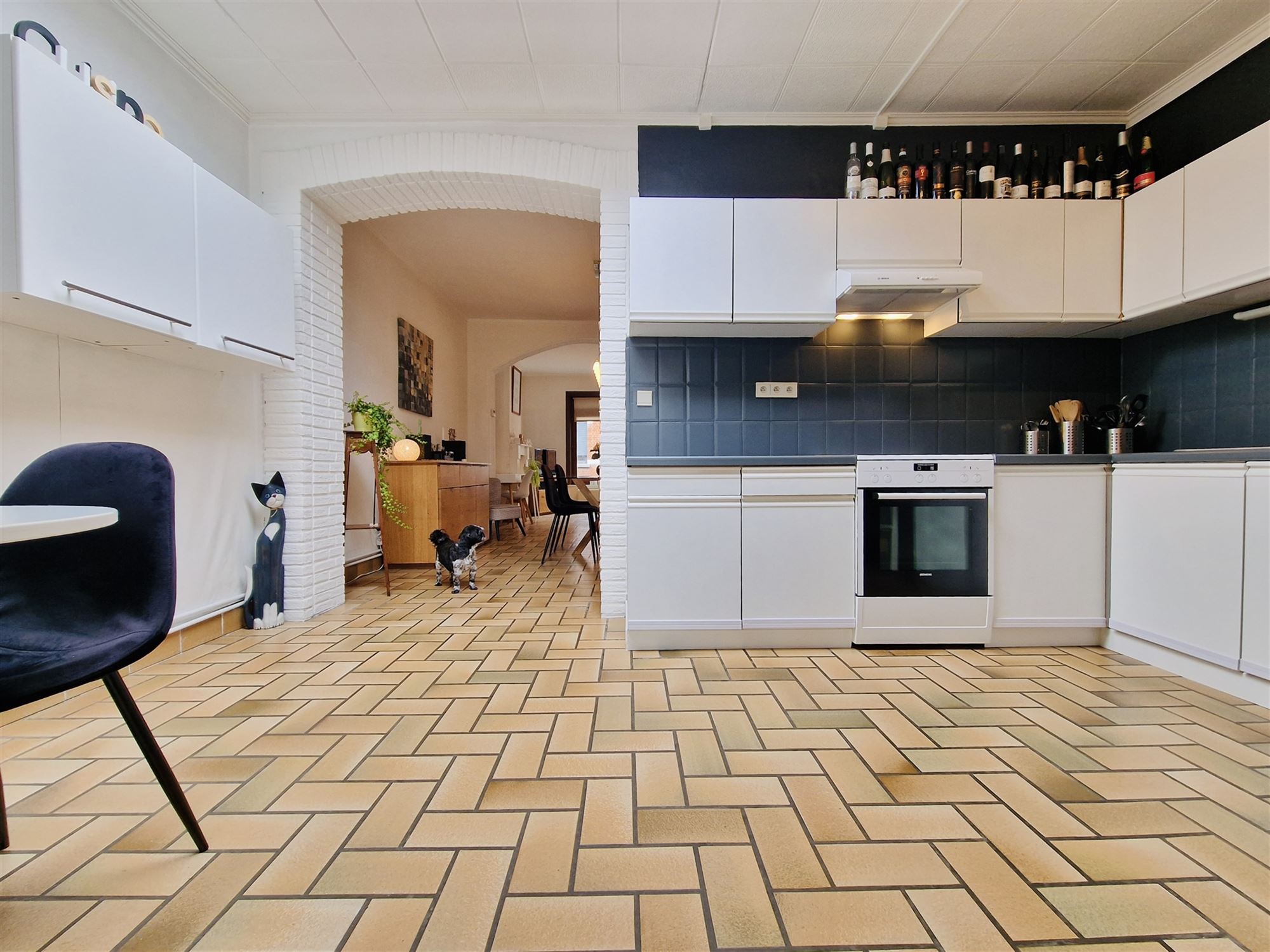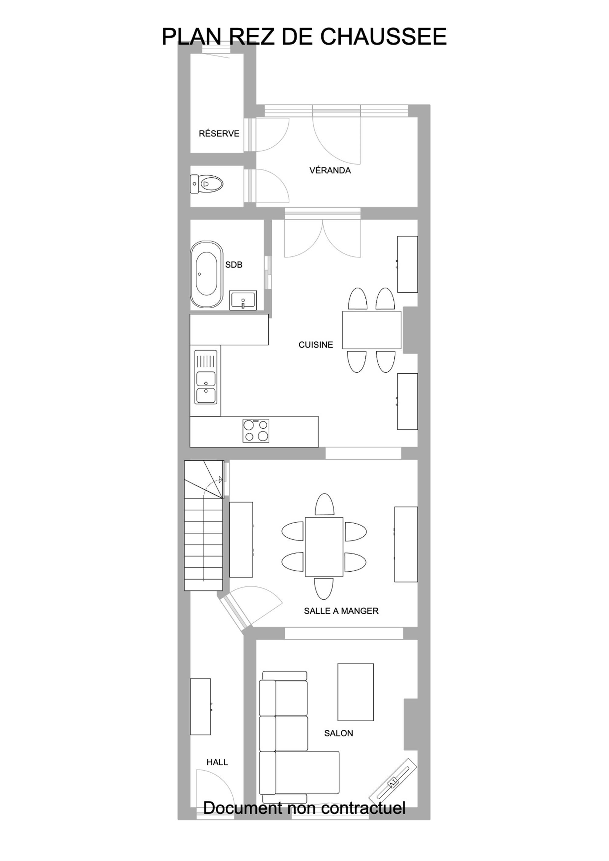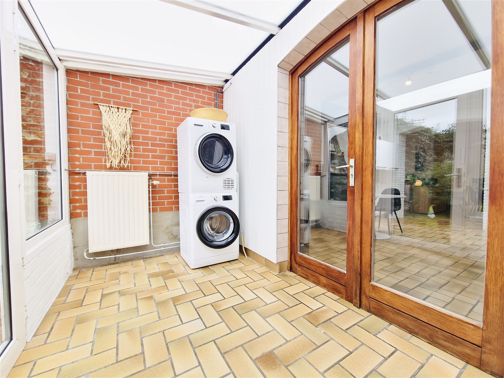 ** Rez-de-chaussée : Un hall d’entrée accueillant vous mène vers un séjour lumineux de 26 m², composé d’un salon et d’une salle à manger avec une grande fenêtre à l’avant. Celui-ci s’ouvre sur une grande cuisine ouverte et équipée de près de 20 m², éclairée par une fenêtre de toit qui inonde l’espace de lumière naturelle. À l’arrière, on retrouve une salle de bains avec lavabo et baignoire, une véranda de 7 m² donnant accès à une toilette séparée, à l’emplacement pour lave-linge/sèche-linge et à un petit débarras.