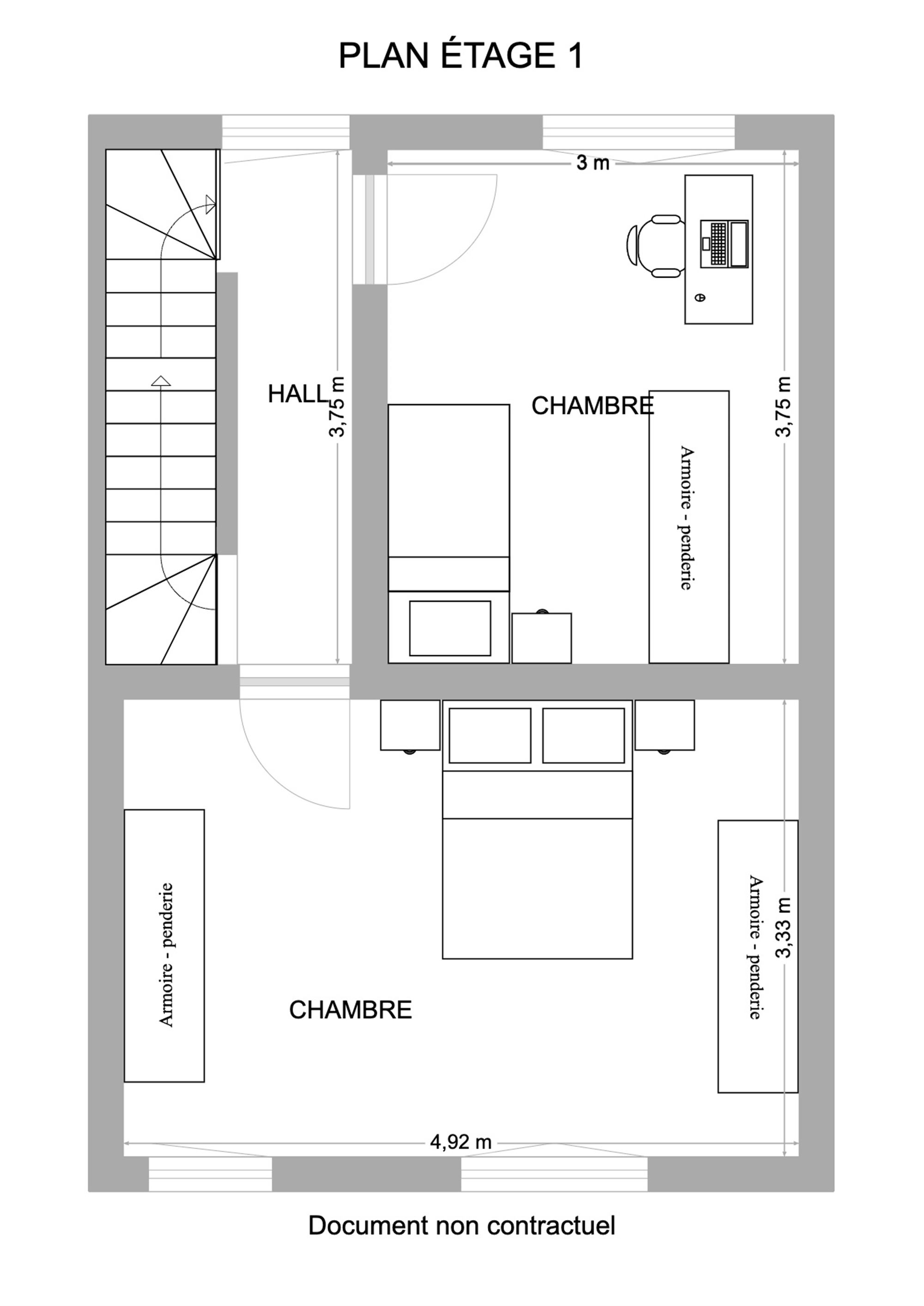 ** Premier étage : Un hall de nuit de 5,8 m² distribue deux chambres : une chambre principale de 16,4 m² et une seconde chambre de 11,3 m².