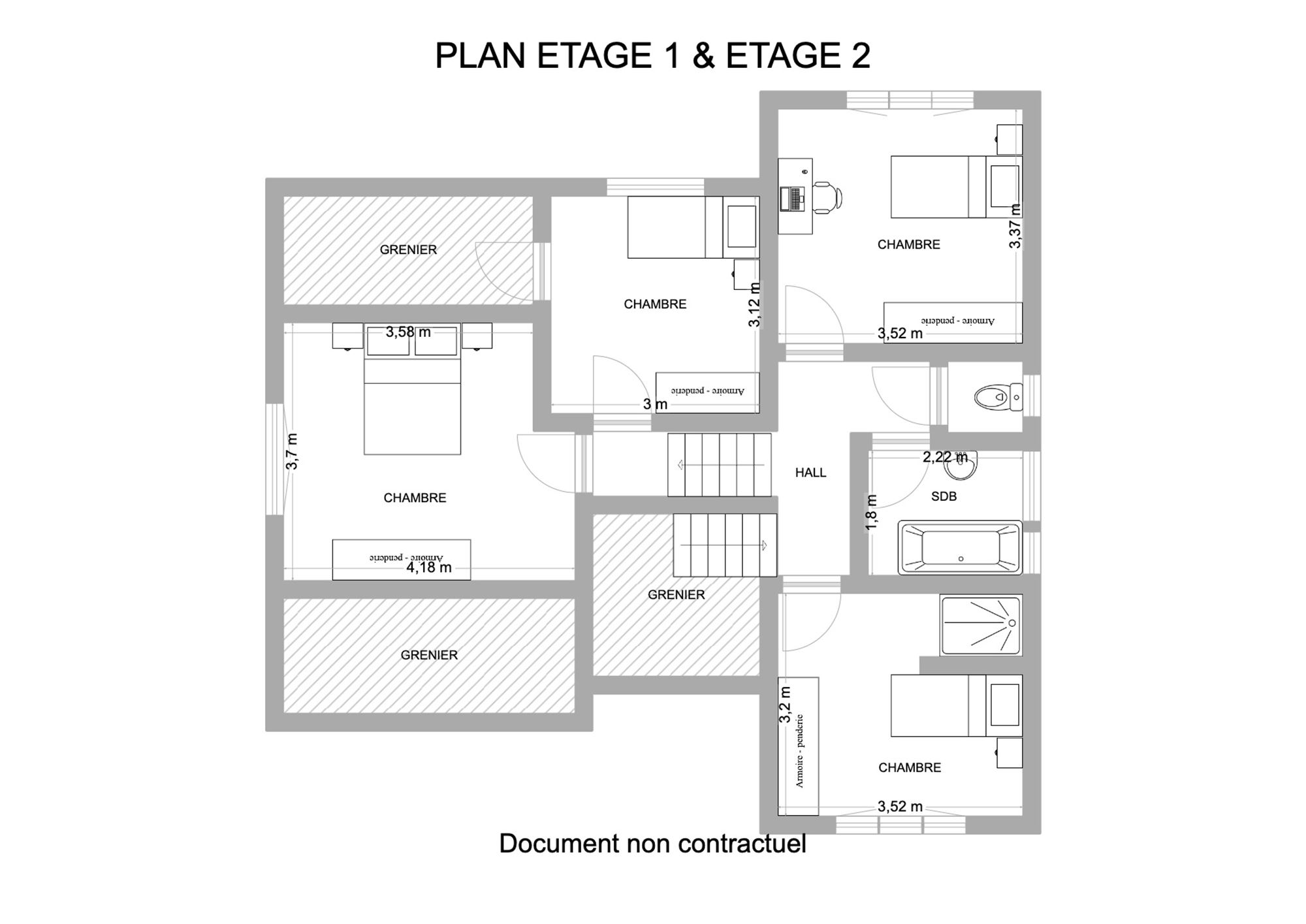 ** Deuxième étage : Deux chambres supplémentaires de 9 m² et 14 m² complètent l’espace nuit.