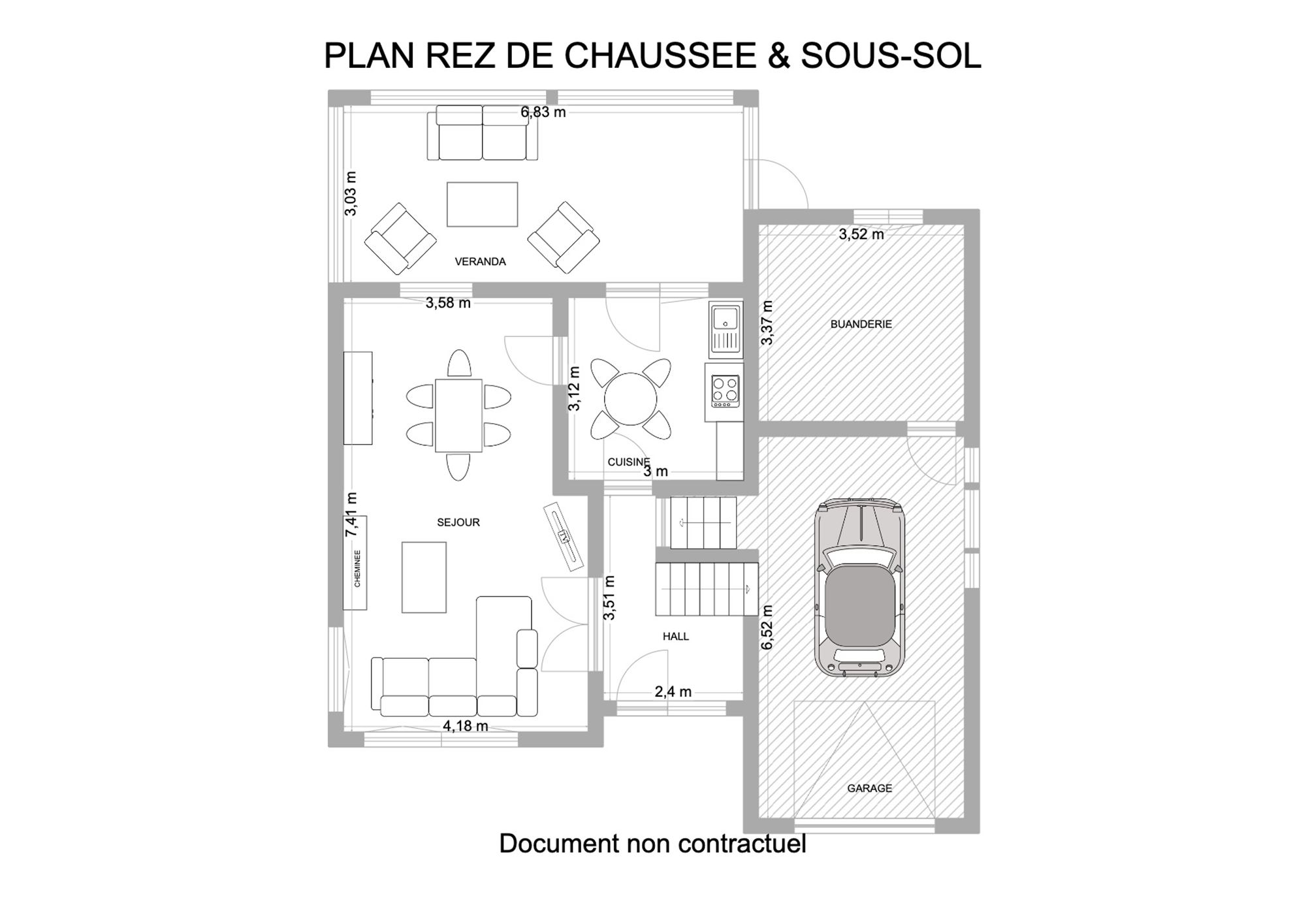 ** Sous-sol : Un garage de 22 m², suivi d’un espace buanderie de 12 m² avec emplacement pour le lave-linge et chaudière Budérus assurant le chauffage central.
