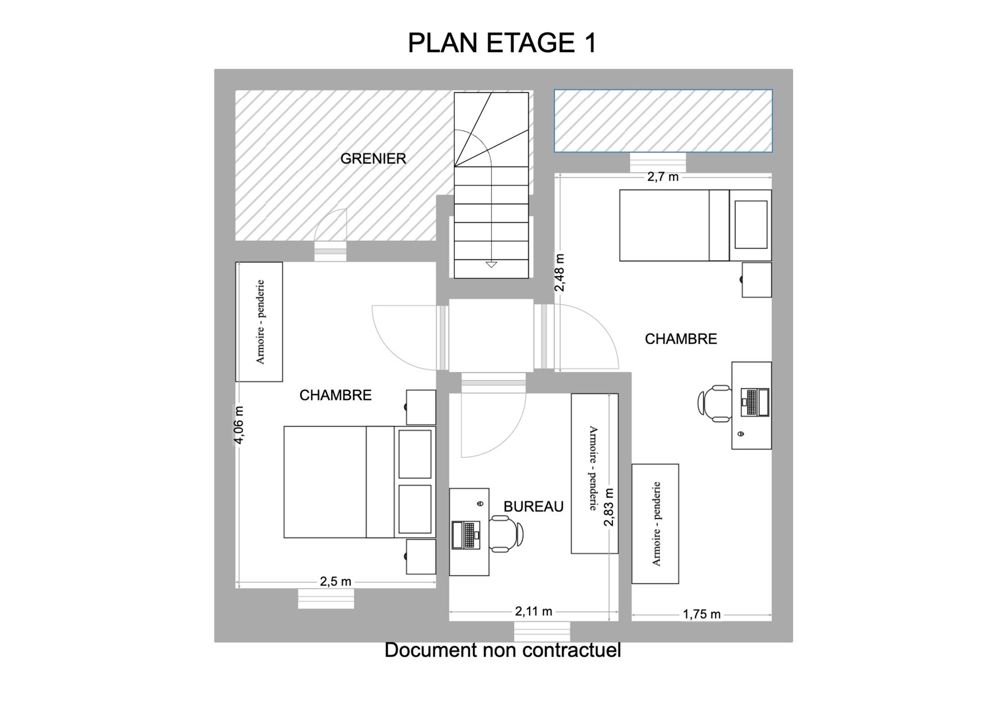 ** Premier étage : Un hall de nuit dessert un petit coin bureau de 5,5 m² et deux chambres à coucher de 11 m² et 9 m².