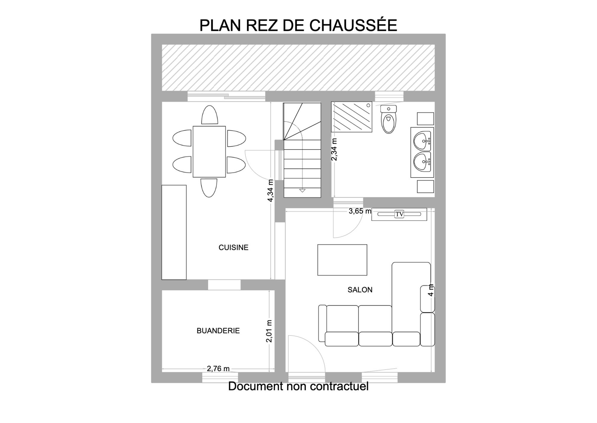 ** Rez-de-chaussée : Dès l’entrée, vous serez séduit par un coin salon lumineux de 15,2 m², ouvert sur un espace salle à manger et cuisine de 12 m². La cuisine est équipée d’une taque au gaz, d’un four, d’un évier et d’une hotte, avec un emplacement prévu pour le frigo. Une salle de douche avec double évier, WC et cabine de douche, ainsi qu’une buanderie avec emplacement pour le lave-linge et la chaudière au gaz à condensation, complètent ce niveau.