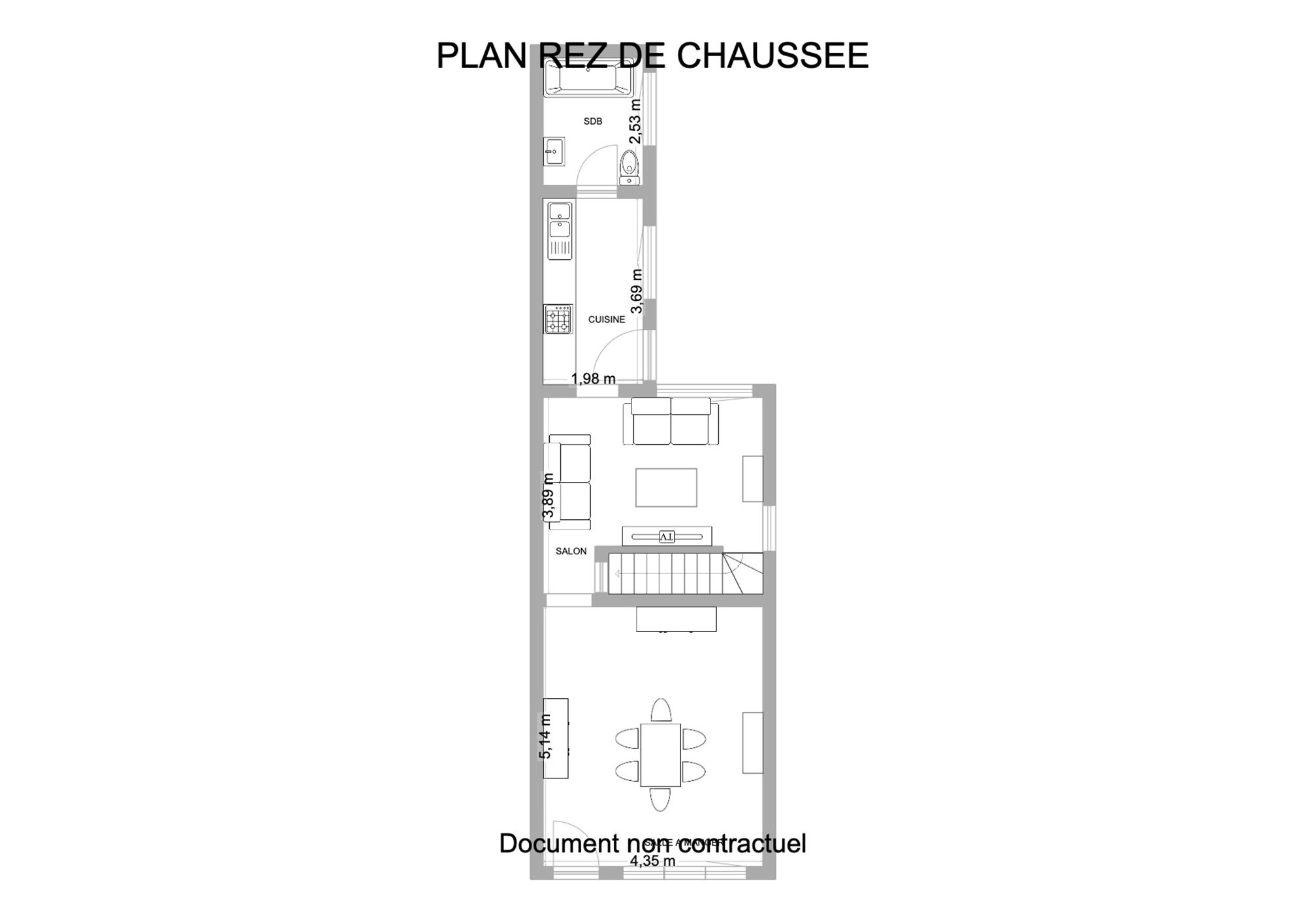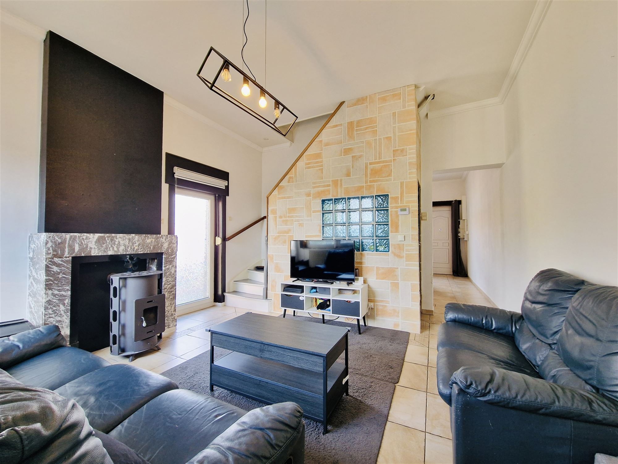 ** Rez-de-chaussée : Dès l’entrée, vous accédez à un espace salle à manger de 22 m² avec poêle au bois. Il mène vers un salon confortable de 21,6m², où l’on retrouve la cage d’escalier et l’accès à la cave. Le rez-de-chaussée se poursuit avec une cuisine équipée avec porte vers l’extérieur, ainsi qu’une salle de bains complète comprenant baignoire-douche, lavabo et WC.