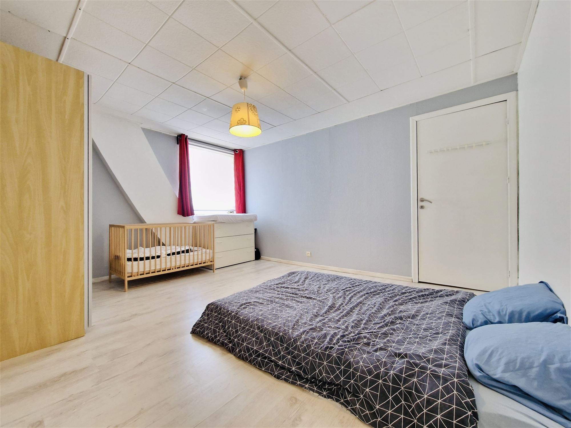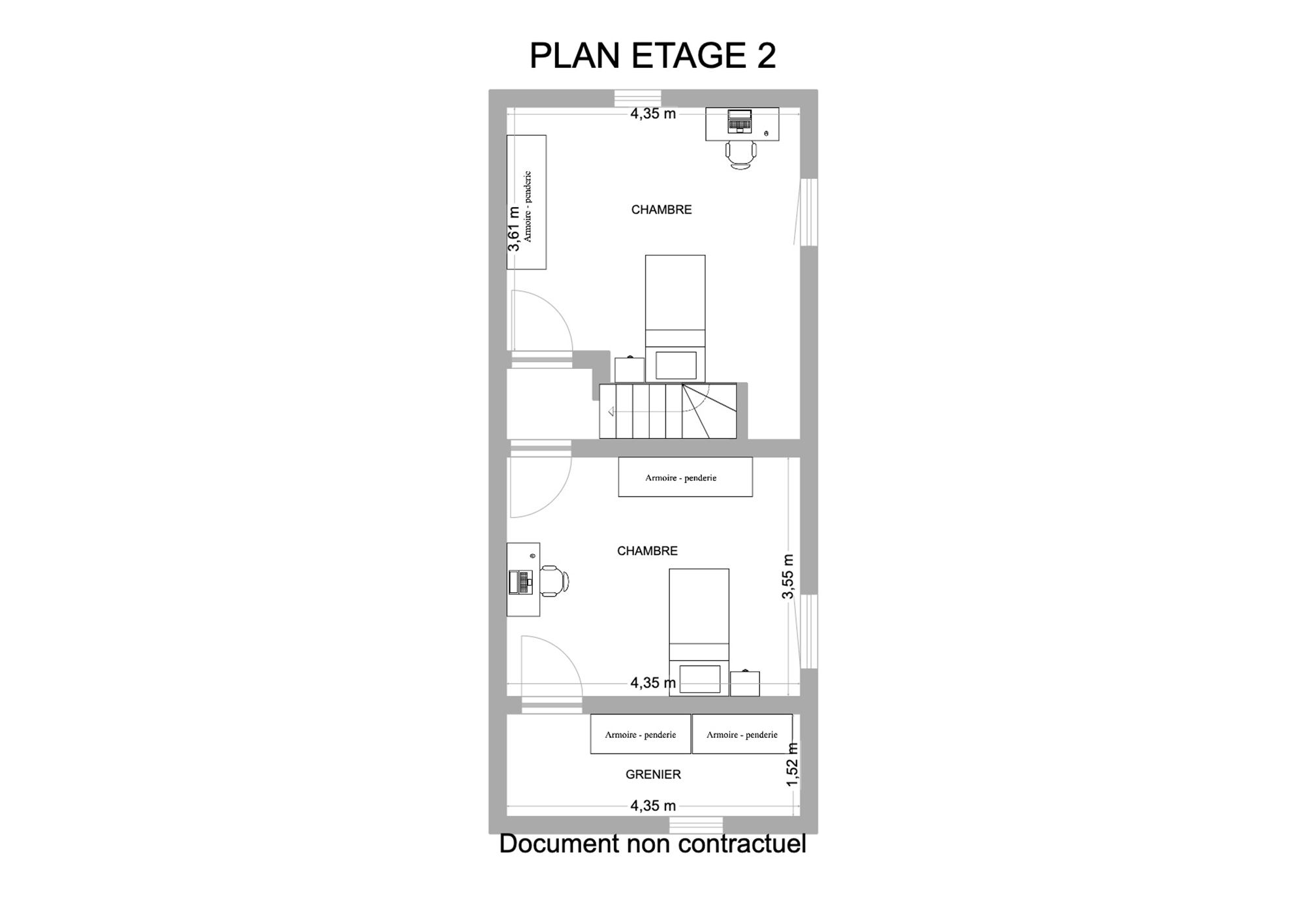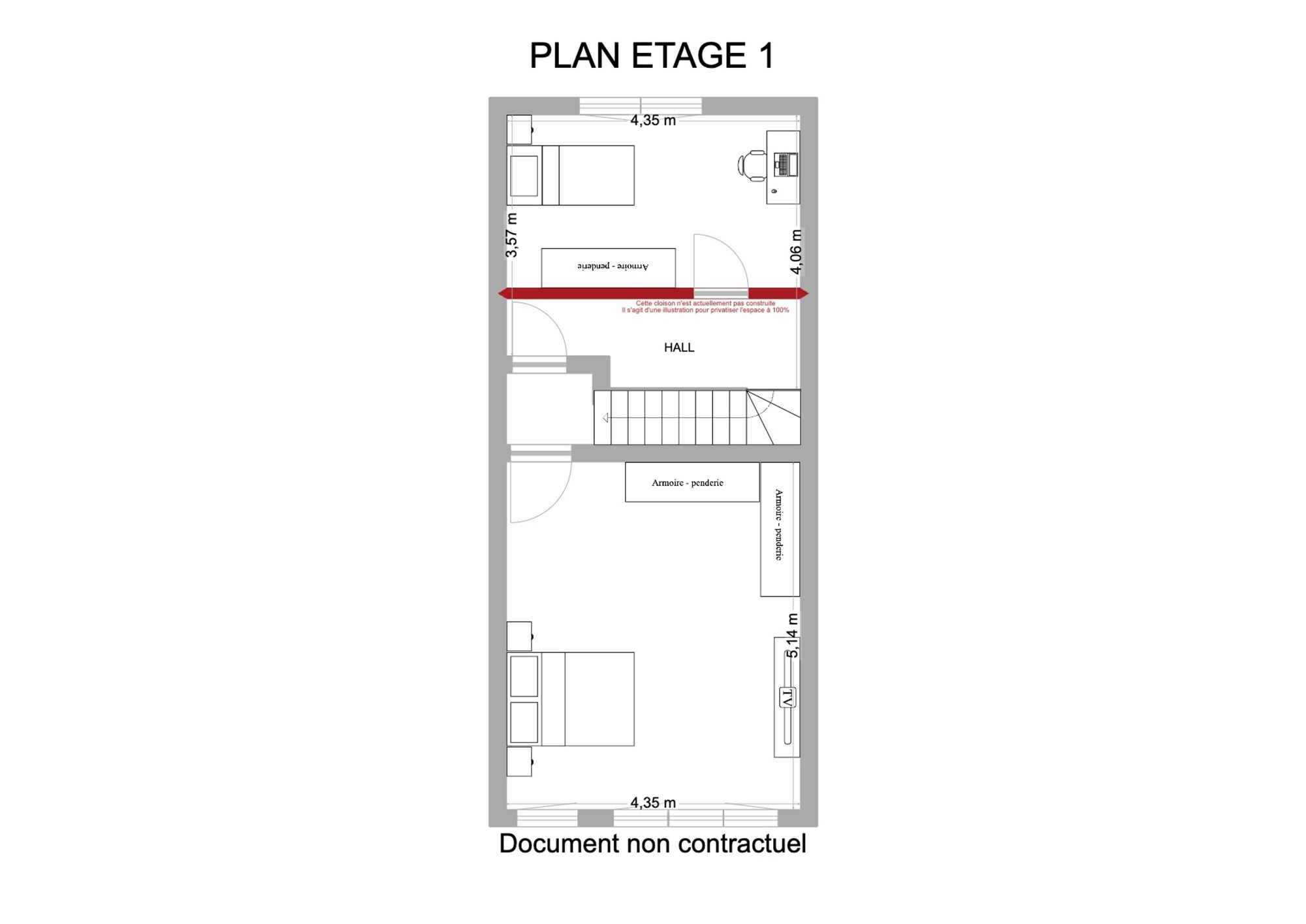 ** Premier étage : Un petit hall de nuit dessert deux chambres : une première de 22,2 m² et une seconde de 17,8 m². Une cloison fictive a été imaginée sur le plan pour envisager un accès indépendant menant vers l’étage 2.