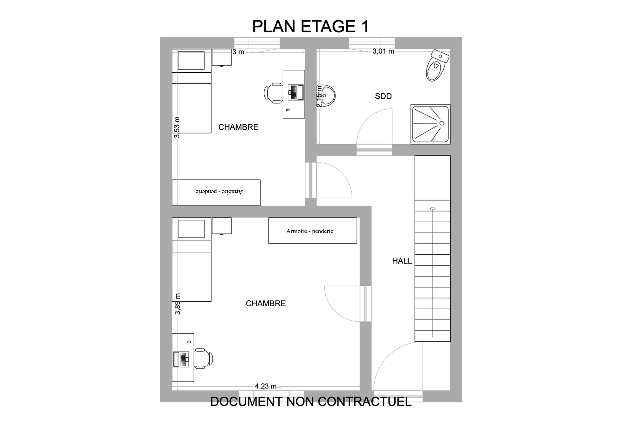 ** Premier étage : Le hall de nuit lumineux dessert deux chambres de 16,5 m² et 10,5 m², ainsi qu’une salle de douche équipée d’une cabine de douche, d’un lavabo et d’un WC.