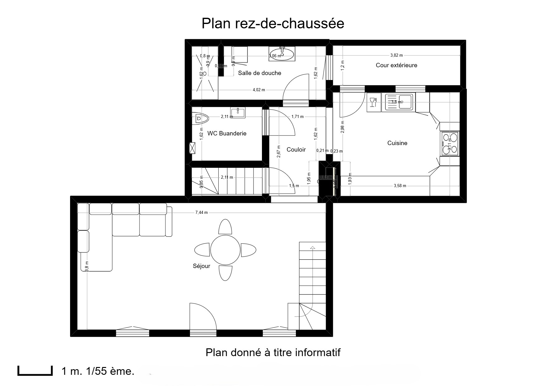 La salle de bains allie praticité et sophistication avec une douche à l’italienne et des finitions élégantes. Le rez-de-chaussée se complète par un espace WC et buanderie.