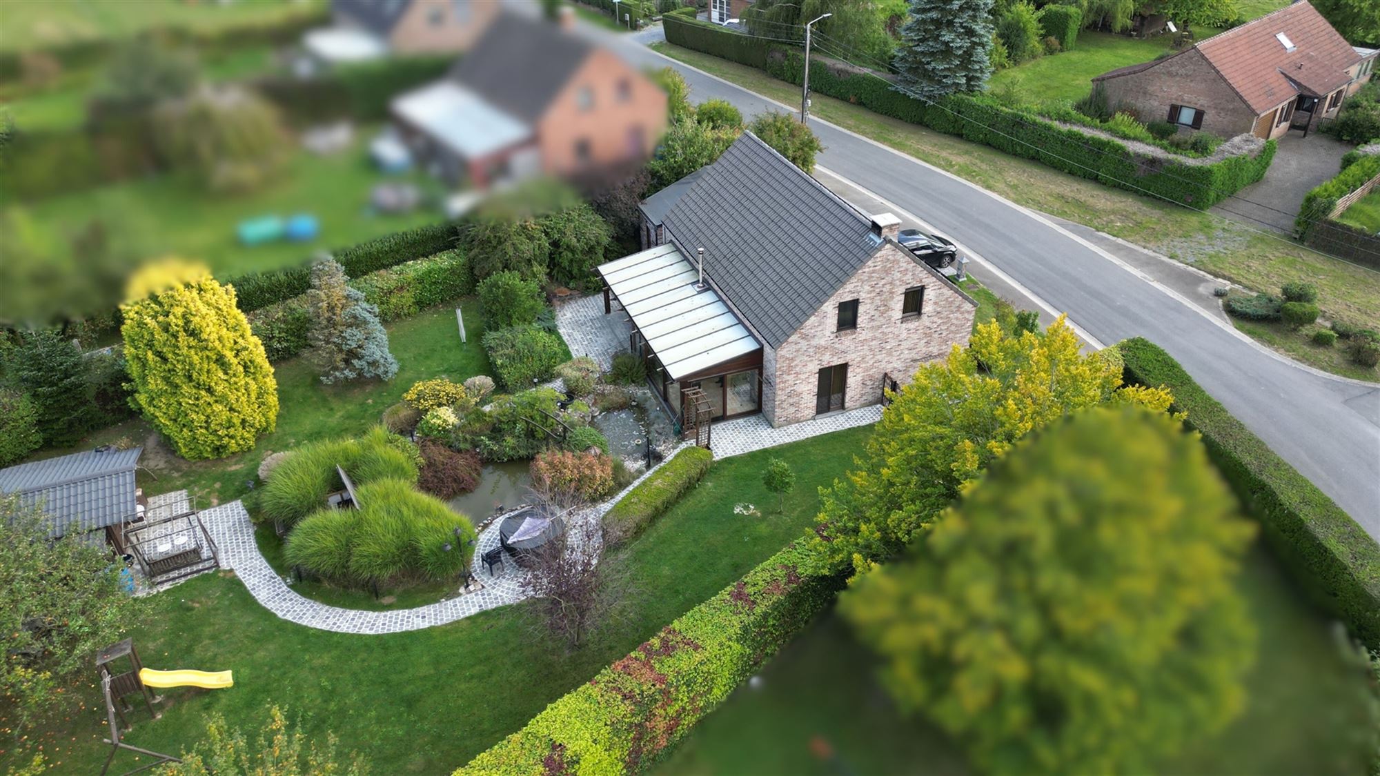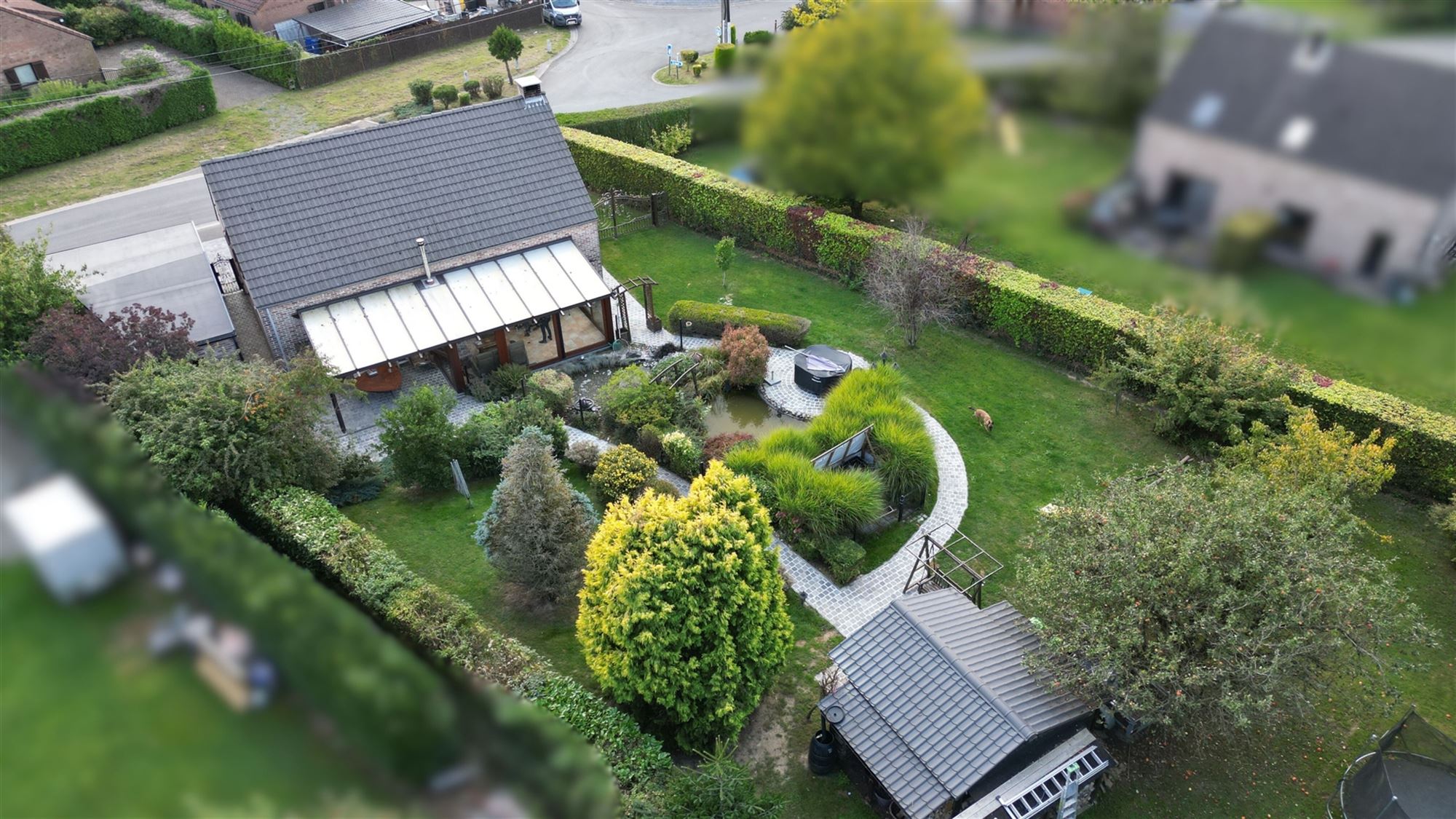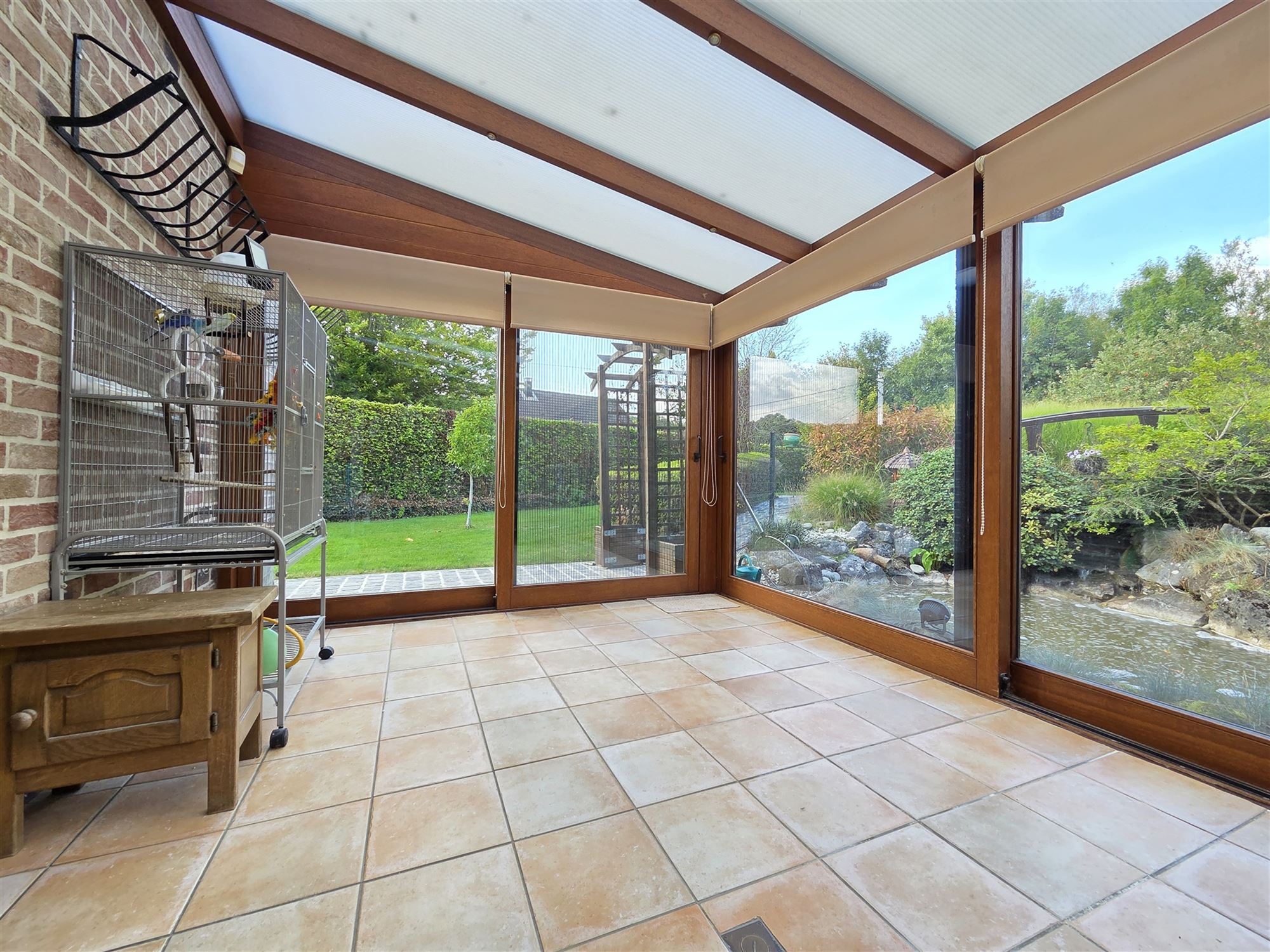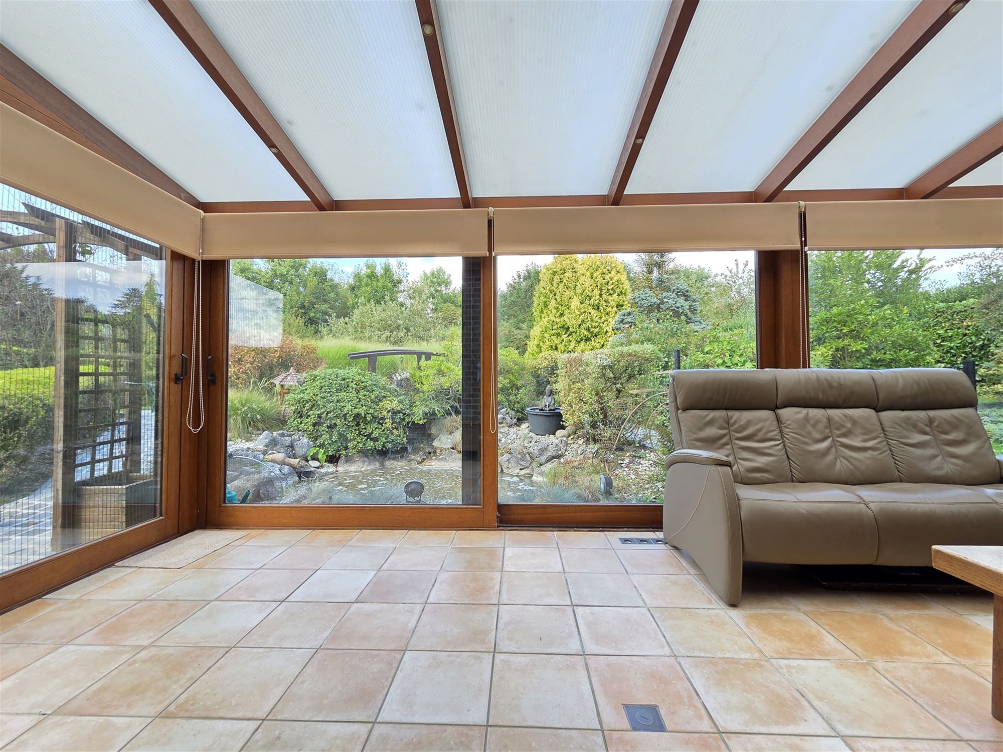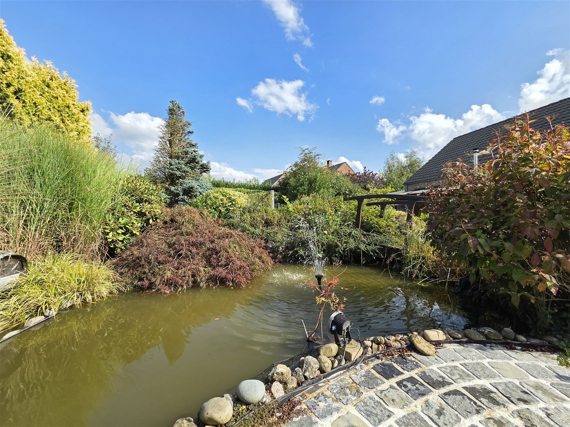 Découvrez la composition de cette habitation confortable offrant une vue imprenable sur le jardin et son étang :