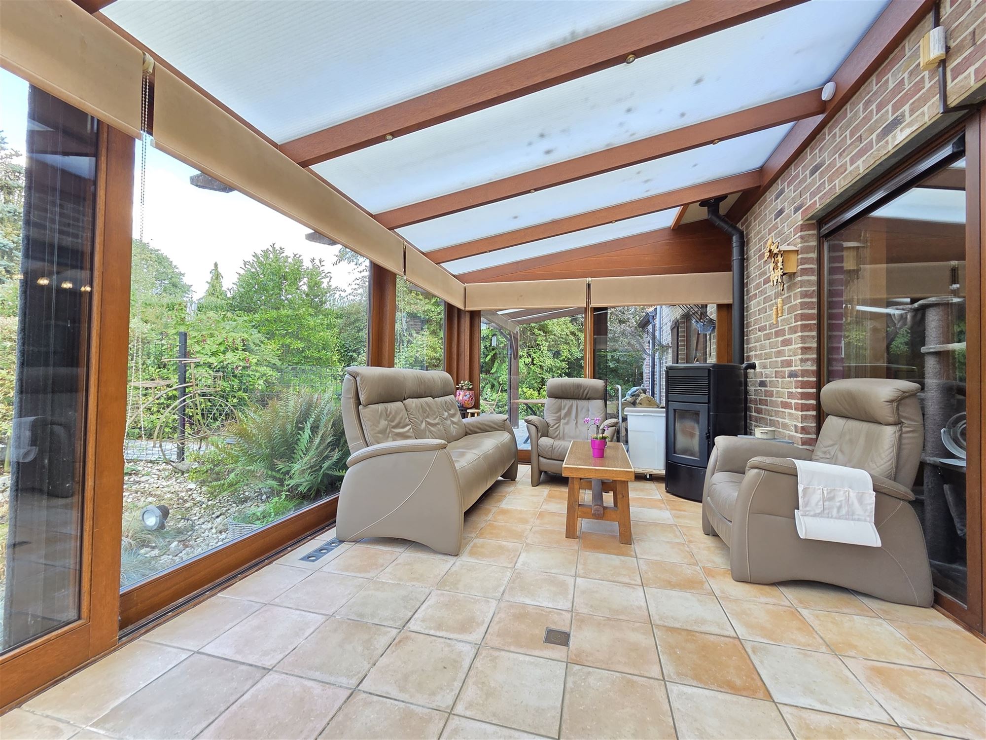 Un hall d’entrée dessert les différentes pièces de vie : un espace séjour lumineux, agrémenté d’un feu ouvert, une chambre de plain-pied, une salle de douche avec lavabo, un WC séparé, une cuisine super équipée, attenante au garage principal, et une véranda chauffée au poêle à pellets, orientée vers le jardin arboré pour une atmosphère de détente totale.