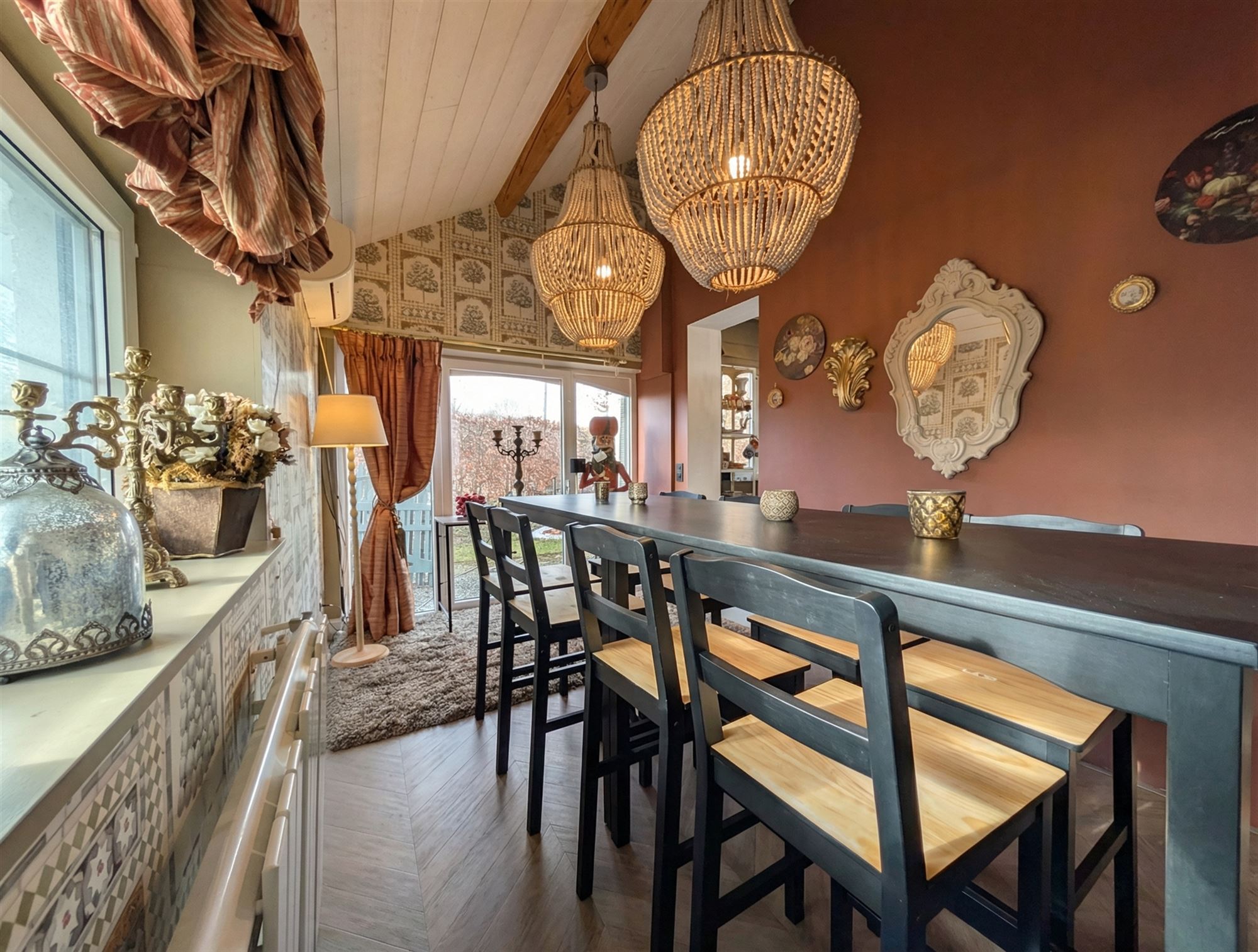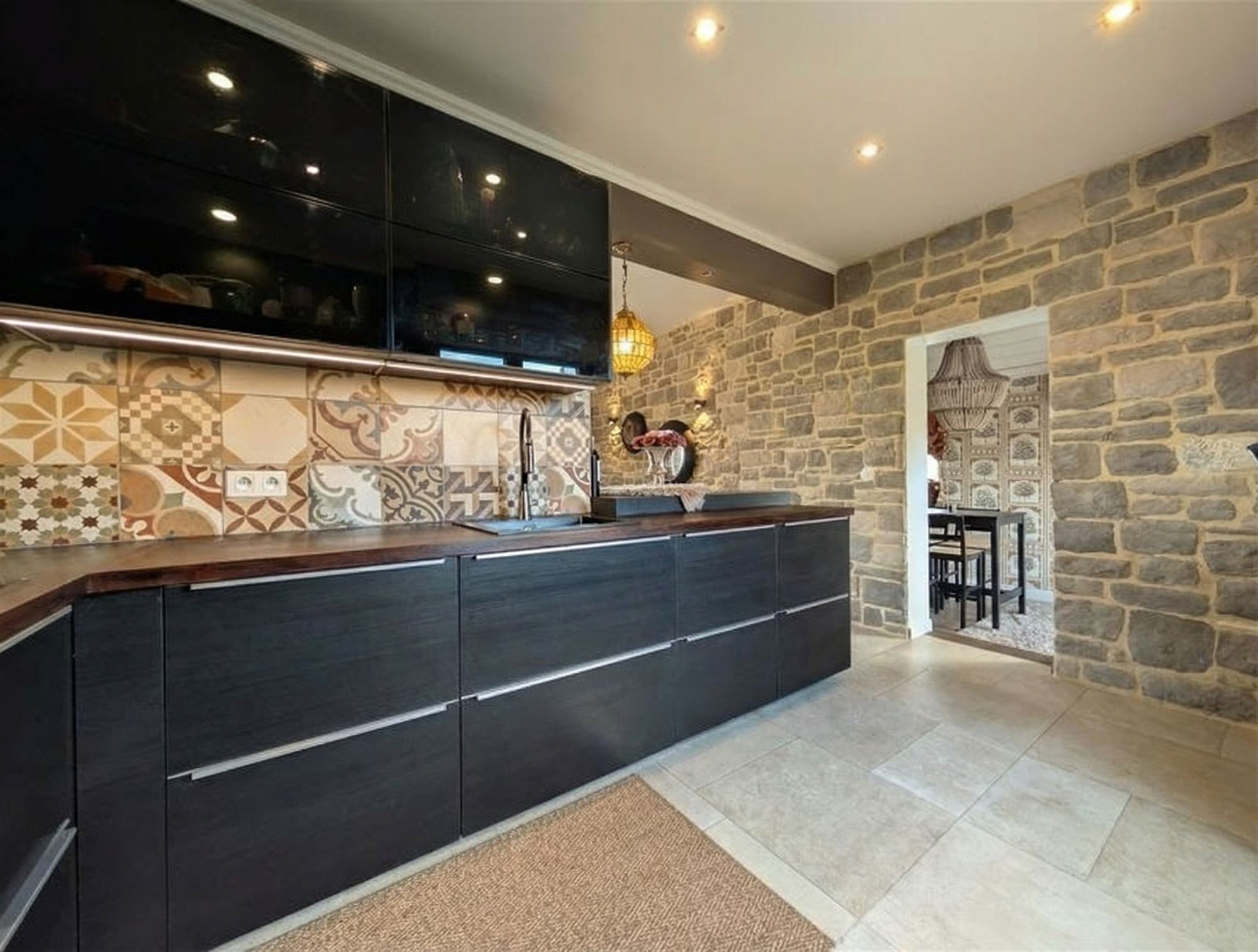 Le séjour, véritable cocon de douceur, est sublimé par un parquet en bois massif et une décoration soignée qui apporte une chaleur immédiate. Agrémenté d’un poêle à bois STUV,