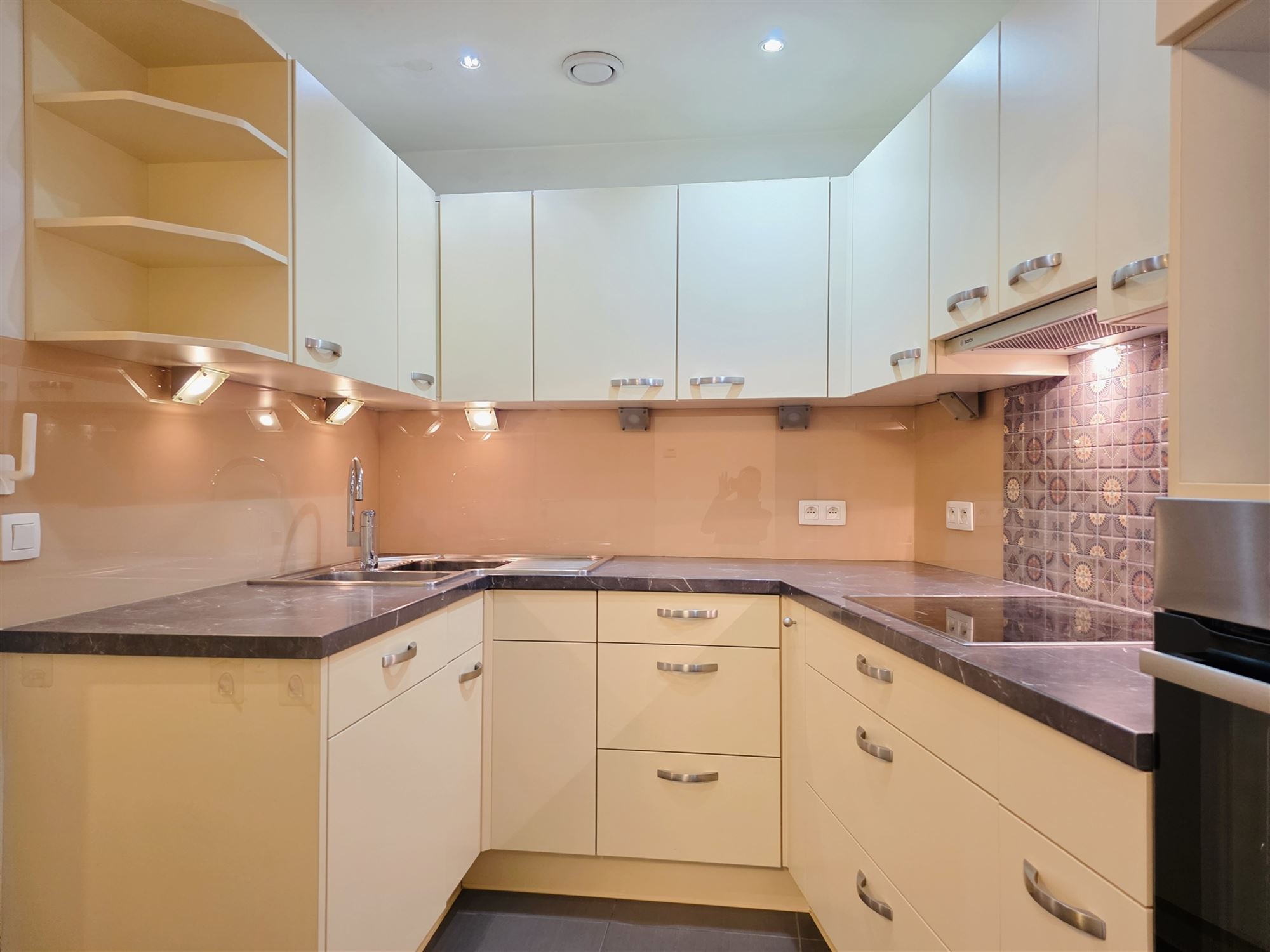 La cuisine équipée, séparée du séjour, dispose d’un frigo, d’un lave-vaisselle, d’une taque de cuisson avec hotte ainsi que d’un évier, et bénéficie d’un espace buanderie pratique.