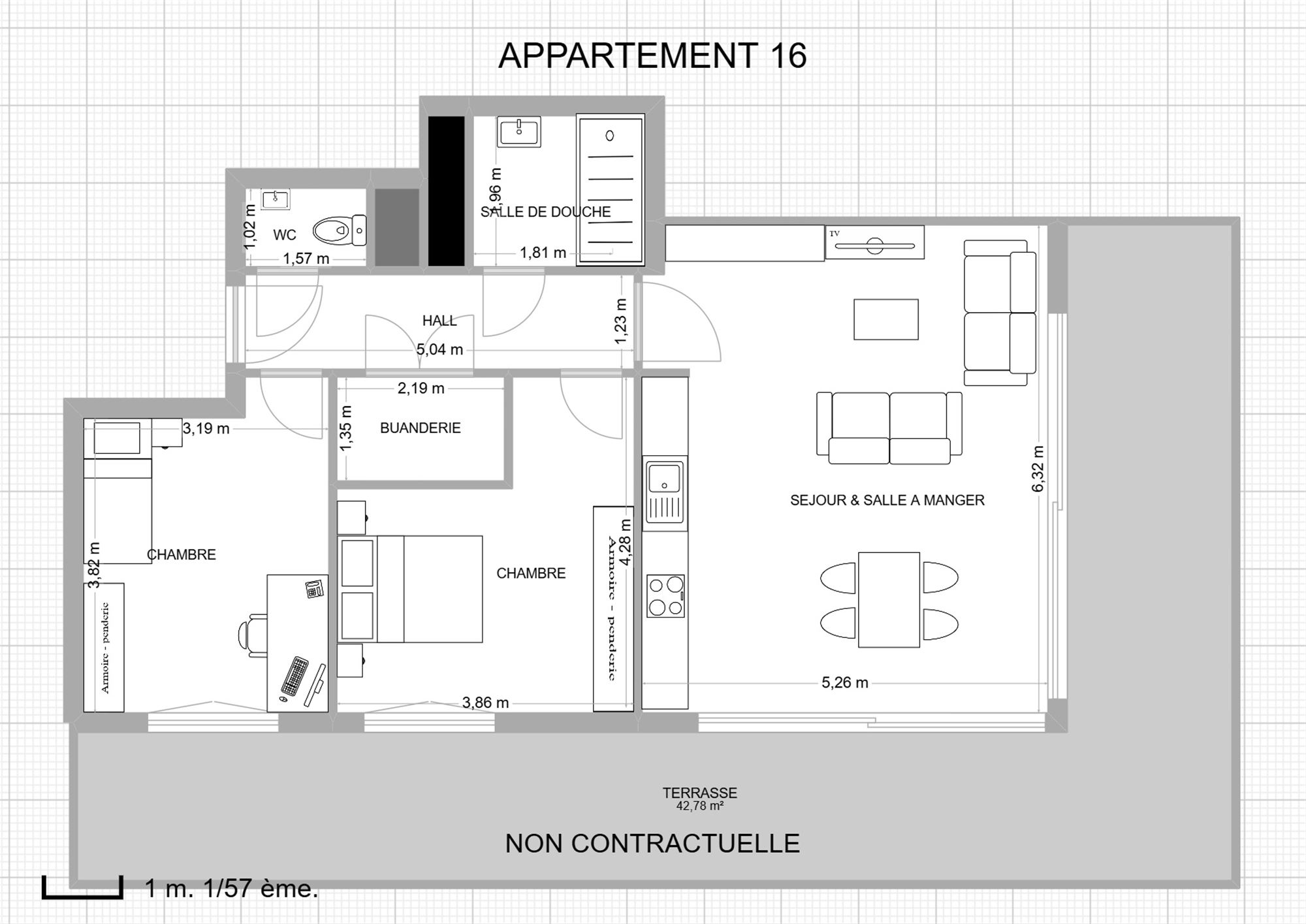Une vaste terrasse de 42,80 m2 offrant une vue dégagée et une luminosité optimale avec une orientation plein SUD.