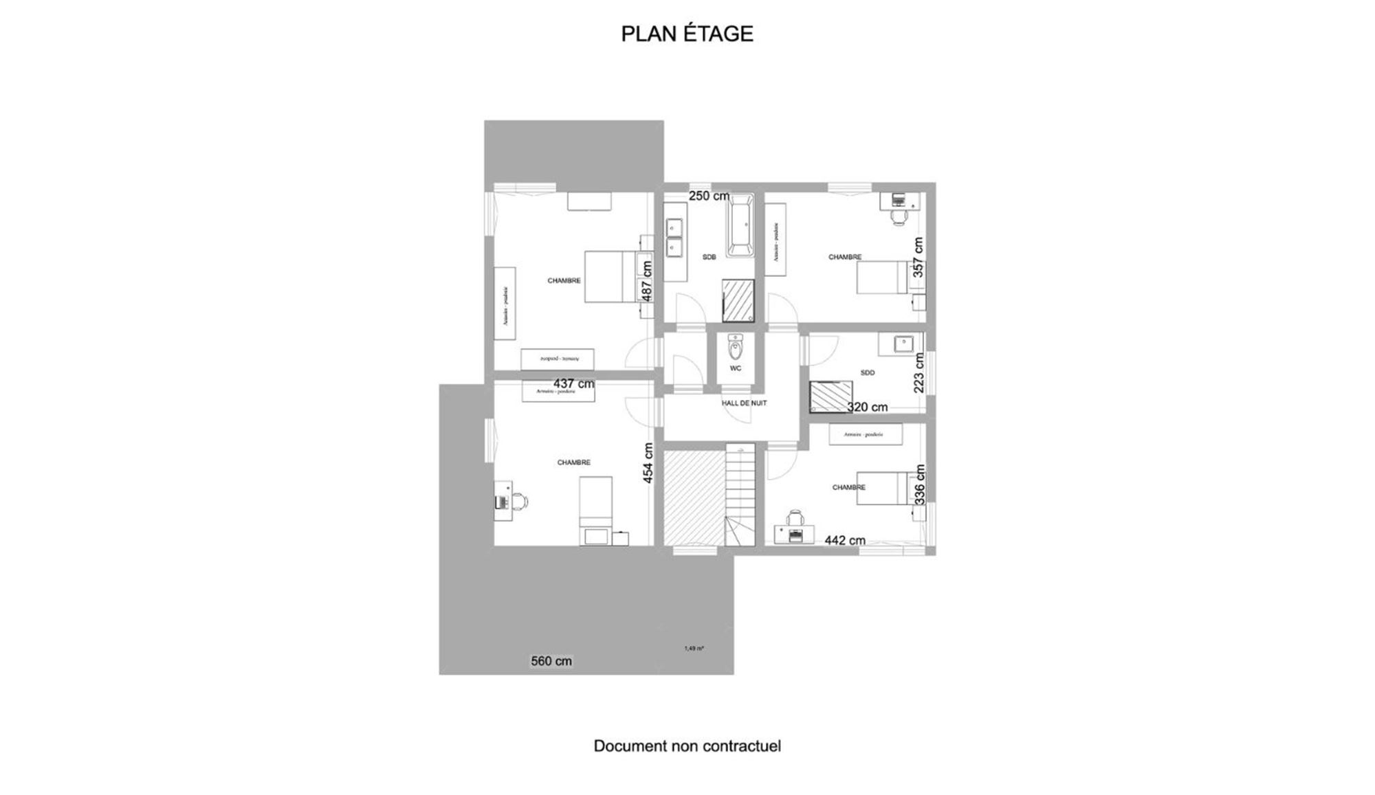 – Étage 1 : hall desservant 4 chambres de belles tailles dont une suite parentale avec salle de bains, une salle de douche et une toilette.